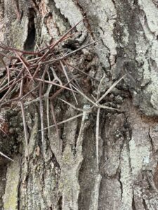 Some bark, such as the European beech on the left, is smooth, while others have coarse, medium or fine texture with shallow or deep furrows. Some bark is white or reddish in color. Some have a peeling or exfoliating appearance; others, such as the honeylocust to the right, have sharp thorns.